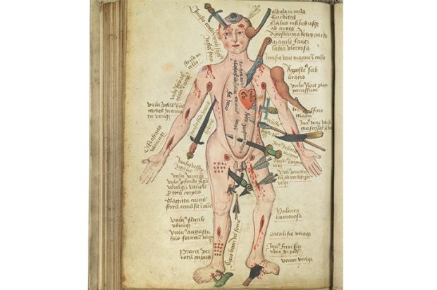 ‘Full of strokes and blows/ broken, pitifully wounded’, the man, naked, or almost so, stands full frontal, legs and arms…