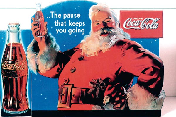 The evolution from Saint Nicholas, sourced in the 4th-century Christian Greek Bishop of Myra, patron saint of children, to the secular, rubicund, guffawing, unwholesome, gift-distributing, grotto-dwelling Santa was fixed in the popular imagination with advertisment artwork for the Coca-Cola Company of Atlanta by a depressive Swedish painter called Haddan Sundblom. Santa belongs not to the ages, but to a US beverage corporation.