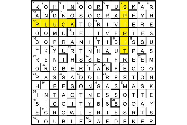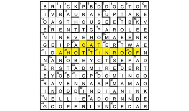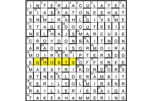 The full quotation was ‘Mother, GIVE ME THE SUN’ (14/7) from Ghosts by HENRIK IBSEN (29/1D). Remaining unclued lights give ME THE SUN: MI/RA (12), MOI/RA (24), MOI/RE (25) and MI/RE (39). GHOSTS (in the ninth row) was to be shaded.