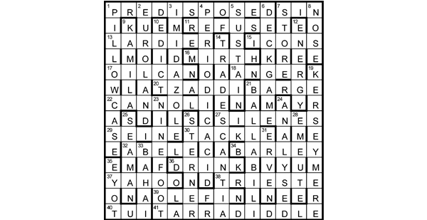 The two words were BULL and BEAR. BULL is suggested by 36, 41, 6 and 10; BEAR by 34, 37, 1D and 5.