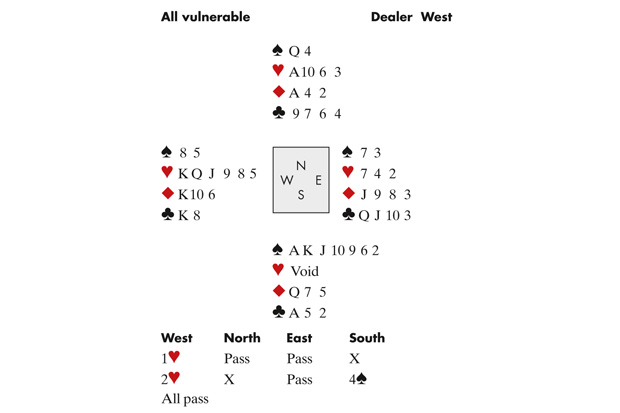 On the following hand, David showed his not inconsiderable skills in the card play. West led the ♥K. How would you plan the play? With seven trumps and three aces, making the contract is not a problem, but this was pairs and the overtrick is worth — well, gold! It looks like it should be possible to put pressure on West, who’s guarding both Hearts and Diamonds, but to get to a favourable position declarer needs to concede a couple of tricks first, and without East getting in, as a Diamond through would kill all communication. Suppose declarer takes the ♥Ace and plays the ♥10, discarding a Club from hand? West can continue a high Heart, and South discards another Club, but now a fourth Heart eliminates the Heart threat in dummy — no good.