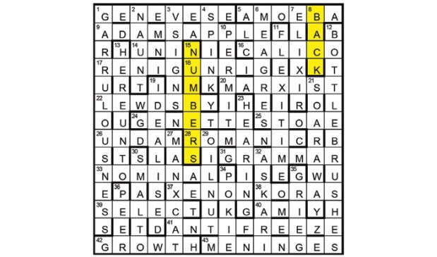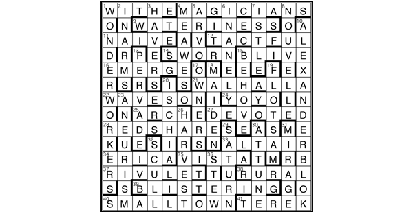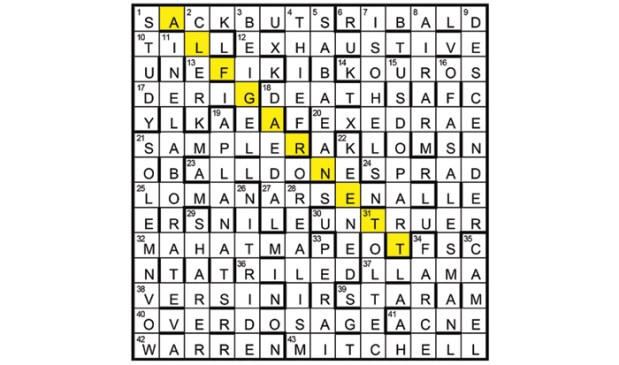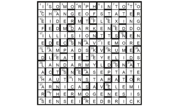 Extra letters in clues give ‘wrapped in wild snow’, a quotation from a poem by ALEXANDER BLOK (10). Partially indicated answers are treated accordingly, the resulting entries at 1D, 14, 17, 22, and 40 being defined by 4A, 27, 3, 19, and 11.