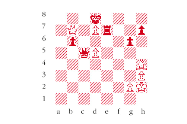 White to play. This position is from Carlsen-Caruana, Zurich 2014. White’s pin against the black rook and the passed pawn on d7 are the key components of his winning combination. What did he play? Answers to me at The Spectator by Tuesday 18 February or via email to victoria@spectator.co.uk or by fax on 020 7681 3773. The winner will be the first correct answer out of a hat, and each week I shall be offering a prize of £20. Please include a postal address and allow six weeks for prize delivery.