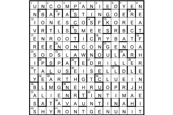 Unclued lights can each be abbreviated so that together they give the letters of FEBRUARY: FAHRENHEIT (19), EARTH (32), BASS (35), RÖNTGEN UNIT (41), UNIVERSITY (1D), ATOMIC WEIGHT (4), RECTOR (12) and YEN (7A).