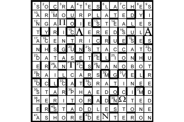 The unclued lights are all CHARACTERS (18D) in Plato’s dialogues, all but SOCRATES (1A) appearing in titles. In six cells, clashing letters could be combined to form letters of the Greek alphabet (e.g. LAMB + DA = LAMBDA) — these six characters spell out the name PLATO in Greek (Πλάτων, using lower case letters, was also acceptable).