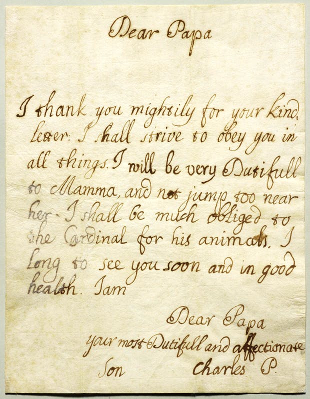 Private documents from more distant monarchs are housed in the archive, although these tend to be rarer. A charming letter from a seven-year-old Bonnie Prince Charlie (above) reassures his father that he is behaving himself during exile in Rome.