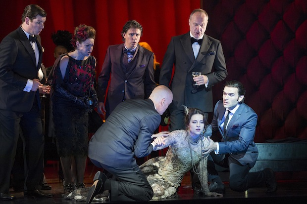 Otherwise the production — updated to an unspecific, semi-abstract and smartly dressed modern world — is often effective but largely anonymous. Hildegard Bechtler’sset features a velvet-upholstered curved wall on the right, a more austere one on the left, various minimal bits of furniture around and about, and a back wall for subtle projections (by Nina Dunn). Violetta materialises, gradually illuminated through a gauze, ahead of each scene before the rest of it appears around her. Act I opens with a tableau of formally dressed cigar smokers to the left, and a red curtain projected at the back, simultaneously bringing to mind two recent ENO Verdi productions: Christopher Alden’s gentlemans’ club Rigoletto and Peter Konwitschny’s own fiercely concentrated take on Traviata. The decision to promote Annina from mere maid to confidante — thankfully not over-emphasised here — also reminded me of Dmitri Tcherniakov’s disappointing 2013 staging at La Scala.