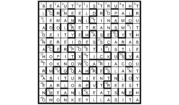 Initial letters of superfluous words in clues give nightingale, quail and cuckoo, specimens of AVIFAUNA (5) represented by FLUTE (43), OBOE (40) and TWO CLARINETS (27 18) in the SIXTH SYMPHONY (13 26D) of BEETHOVEN (14). The symphony is known as the PASTORAL (1D/41, suggested by the puzzle’s title).