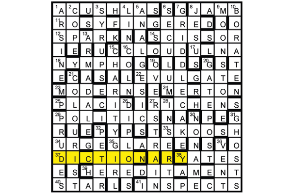 Gerry Goffin, popular LYRICIST (40), died on 19 June 2014. He wrote the perimetric songs IT MIGHT AS WELL RAIN UNTIL SEPTEMBER and WILL YOU LOVE ME TOMORROW and also ONE FINE DAY (2), for which Carole King composed the music. The ‘linked’ GOFFIN (7th row) and KING (7th column) were to be shaded. The title refers to ‘Half Way to Paradise’, another Goffin and King song.