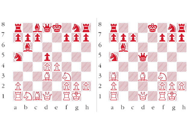 1 e4 e5 2 Nf3 Nc6 3 Bc4 Bc5 White’s next move introduces the infamous Evans Gambit, which has entranced aggressive players from Morphy to Kasparov. 4 b4 Bxb4 5 c3 Bc5 6 d4 exd4 7 cxd4 Bb6 8 0-0 Na5 9 Bd3 d5 (see diagram 1) Opening up the centre, while still undeveloped, is precisely what Black should not do. 10 exd5 Qxd5 11 Ba3 Be6 12 Nc3 Qd7 The punishment is condign. 13 d5 Bxd5 14 Nxd5 Qxd5 (see diagram 2) 15 Bb5+ A brilliant coup which exposes all of the defects in Black’s camp. 15 … Qxb5 16 Re1+ Ne7 17 Rb1 Qa6 18 Rxe7+ Kf8 19 Qd5 Qc4 20 Rxf7+ Kg8 21 Rf8 checkmate On board patricide. Morphy concludes this sparkling little gem of a game with a dazzling double discovered checkmate.