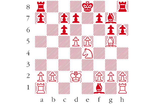 White to play. This position is from Yu–Ganguly, Indonesia 2012. This encounter also started with the Scotch Game opening. Both sides have a bishop en prise. How can White turn the tactics to his advantage? Answers to me at The Spectator by Tuesday 30 September or via email to victoria@spectator.co.uk or by fax on 020 7681 3773. The winner will be the first correct answer out of a hat, and each week I am offering a prize of £20. Please include a postal address and allow six weeks for prize delivery.