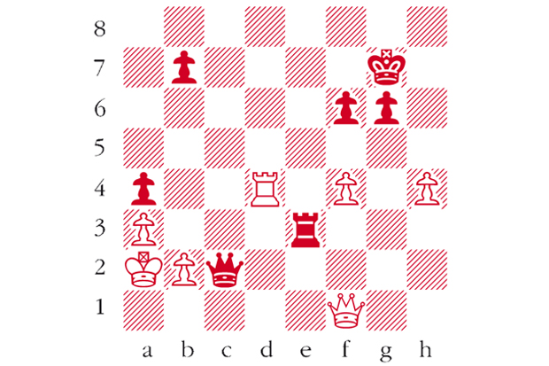 Black to play. This position is a variation from Anand-Carlsen; World Championship, Sochi (Game 1) 2014. Can you spot Black’s winning coup? Answers to me at The Spectator by Tuesday 18 November or via email to victoria@spectator.co.uk or by fax on 020 7681 3773. The winner will be the first correct answer out of a hat, and each week I am offering a prize of £20. Please include a postal address and allow six weeks for prize delivery.