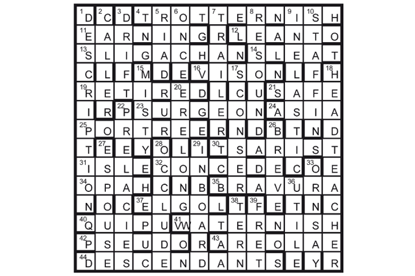 The unclued are locations on SKYE, ‘The Misty Isle’ (solutions at 15 and 31). ISLE does double duty in 15/31 and 31/33. The title suggests ‘Over the sea to Skye’, the isle now being linked to the mainland by a bridge. V/W at 41 Across refers to the alternatives Waternish and Vaternish.