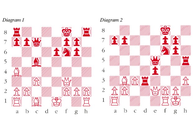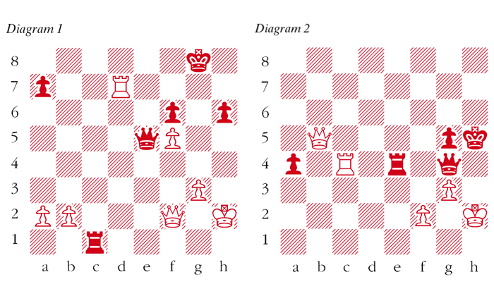 In the next parallel example, a similar attack emerges with the white queen retreating to the back rank in order to smash Black’s resistance. The elegance of White’s solution is only somewhat vitiated by the existence of an equally effective alternative.
