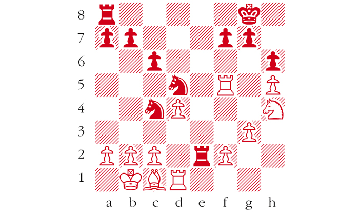 Black to play. This position is a variation from Ganguly-Vitiugov, Gibraltar 2014. The game started as a Caro-Kann and is mentioned in Houska’s book. Although Black is a pawn down he has very active pieces he can exploit with a clever tactic. Can you see it? Answers to me at The Spectator by Monday 30 March or via email to victoria@spectator.co.uk or by fax on 020 7961 0058. The winner will be the first correct answer out of a hat, and each week I am offering a prize of £20.