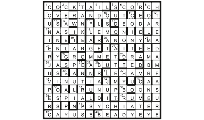 Corrections of misprints in clues give BETWEEN THE SHEETS, the name of a COCKTAIL (1A) whose contents (11, 18/34, 29 and 40) appear in the grid between the sheets (19 and 21).
