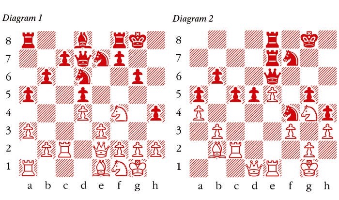 1 d4 Nf6 2 c4 e6 3 Nc3 Bb4 4 e3 b6 5 Nge2 Ba6 6 a3 Be7 7 Ng3 d5 8 cxd5 Bxf1 9 Nxf1 exd5 10 Ng3 Qd7 Black has emerged from the opening with a good game. He has solved all his development problems, and the exchange of light-squared bishops has left White with weaknesses on the light squares, as well as a rather poor bishop. 11 Qf3 Nc6 12 0-0 g6 13 Bd2 0-0 14 Nce2 h5 Seizing the initiative, and threatening to drive back the knight from g3, thus further undermining White’s hopes of achieving e4. 15 Rfc1 h4 16 Nf1 Ne4 17 Nf4 a5 18 Rc2 Bd8 19 Be1 Ne7 20 Qe2 Nd6 (see diagram 1) 21 f3 The advance e4 is White’s only real hope of serious counterplay, so he feels obliged to attempt it, but there is always the risk that, if he fails to get in e4 in favourable circumstances, f3 will just prove to be a weakening, as in fact happens. 21 … g5 22 Nd3 Qe6 23 a4 Ng6 24 h3 f5 25 Bc3 Bronstein writes that Botvinnik clearly feared … Rf7, … Bf6 and … f4, so he overprotects d4. However, the problem with this move is that he relieves Black of any worries over his c7-pawn, which permits the black queen’s rook to come to the e-file. Sveshnikov’s suggestion of 25 Rac1 would at least make that plan more difficult to carry out. 25 … Bf6 26 Re1 Rae8 27 Qd1 Rf7 28 b3 Rfe7 29 Bb2 Black’s build-up has been completed and his pressure down the e-file reaches its apotheosis. Time for the breakthrough. 29 … f4 30 Ne5 Bxe5 Not 30 … Nxe5? 31 dxe5 Bxe5 32 exf4 White is winning, because of the pin down the e-file: for example, 32 … Bd4+ 33 Qxd4 Qxe1 34 Qh8+ Kf7 35 Qf6+ Kg8 36 f5 and Black is busted. 31 dxe5 Nf7 32 exf4 Nxf4 33 Nh2 c5 34 Ng4 (see diagram 2) 34 … d4 A time-trouble mistake that could have cost him dearly. Instead, 34 … Qg6 keeps a large advantage, the difference from the next note being that now 35 Bc1 is met simply by 35 … Nxe5. 35 Nf6+?? A shocker of a blunder. Black is only slightly better after 35 Bc1. 35 … Qxf6 White resigns