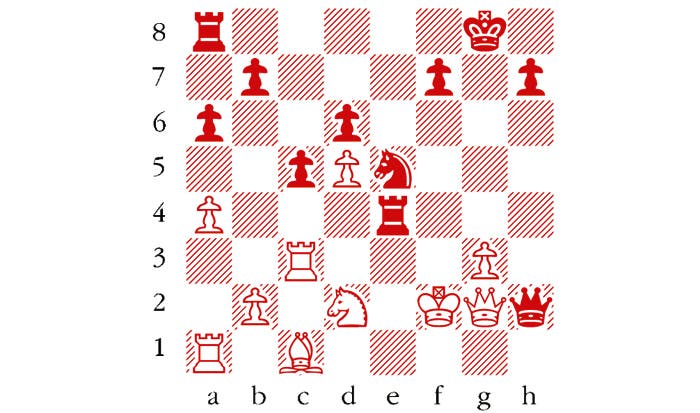 Black to play. This position is a variation from Troff-Nakamura, US Championship 2015. How can Black conclude his kingside attack with a standard tactic? Answers to me at The Spectator by Tuesday 28 April or via email to victoria@spectator.co.uk or by fax on 020 7681 3773. The winner will be the first correct answer out of a hat, and each week I am offering a prize of £20. Please include a postal address and allow six weeks for prize delivery.