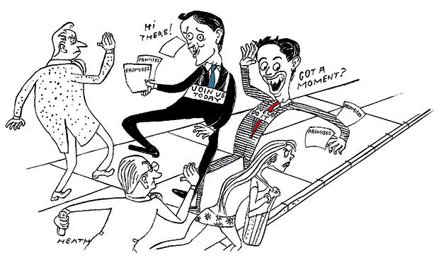 The nation greeted with well disguised enthusiasm the beginning of the general election campaign after the dissolution of parliament. David Cameron, the Prime Minister, stood at a little plywood lectern in Downing Street and said: ‘In 38 days you face a stark choice’ — between him and Ed Miliband, the leader of the Labour party. The Conservatives said they would create two million jobs in the next parliament. Their claims that Labour’s plans would cost each household £3,028 extra in taxes were met with baffled scepticism by the Institute for Fiscal Studies. Some business leaders indignantly rejected Labour’s claims on a poster that they supported the party’s opposition to a referendum on Britain’s membership of the EU. The Financial Times said that the Liberal Democrats wanted EU citizens residing in the United Kingdom to vote in any referendum on Britain’s membership, as the price of the party agreeing to a coalition with the Conservatives.