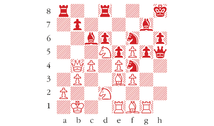 Here Judit found a clever tactic which swiftly turned the game in her favour. 28 … Qh4 This move is a curious form of a fork. The black queen obviously attacks the rook on e1 but also, far less obviously, also targets the white queen on b4 — despite the fact that there are three intervening pieces along the fourth rank. 29 Rc1 Bxd5 30 cxd5 N4xd5 The remarkable point of Black’s play. The pin along the fourth rank enables this tactic. 31 Bxg5 There is nothing better. 31 … Qxg5 32 Rxg5 Nxb4 33 Rg2 d5 With an extra piece Black went on to win easily. 34 exd5 Nfxd5 35 Ne4 Ne3 36 f6 Bf8 37 Rh2 Rac8 38 Bc4 Nxc4 39 bxc4 Kg8 40 Rb2 Rc7 41 c5 Nd3 42 Rd2 Rcd7 43 c6 bxc6 44 Rxc6 Kf7 45 Rb6 Nc5 46 Rxd7+ Rxd7 47 Nf2 h5 48 Rc6 Rd2 49 Nh3 Ne6 50 a4 Rh2 White resigns