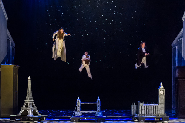 Blink at the wrong time and you’ll miss the key. There amid the alphabet blocks that spell out N.E.V.E.R.L.A.N.D. at the close of Act I in Jason Southgate’s Victorian nursery design is a London underground roundel: Sloane Square. This is the station where Peter Llewellyn Davies, one of five brothers whom tiny, mother-fixated J.M. Barrie befriended, threw himself in front of a train in 1960. Sorrow and rage are present in all of Barrie’s Peter Pan stories, especially in the novel Peter and Wendy (1911), but in Keith Warner’s production the footnotes overwhelm the text. Trains are everywhere, taking Mr Darling (Ashley Holland) to work and defining him as ‘a father who leaves the house at the same time as every other father’, circling through the nursery and propelling the pirate ship commanded by Captain Hook (Holland again). His is not the only transformation. Nana (Aidan Smith) morphs from dog to maid (‘Woof! Woof! Bath! Bed!’), while tender, fragile, hysterical Mrs Darling (Hilary Summers) is reborn as the fearless warrior princess Tiger Lily. Tinker Bell is a dancing animation until she drinks the poison meant for Peter and becomes a drab little doll.