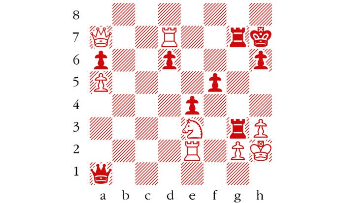 Black to play. This is from Williams-Hawkins, -British Championship 2014. How can Black finish off his attack with a fine flourish? Answers to me at The Spectator by Tuesday 28 July or via email to victoria@spectator.co.uk or by fax on 020 7681 3773. The winner will be the first correct answer out of a hat, and each week there is a prize of £20. Please include a postal address and allow six weeks for prize delivery.