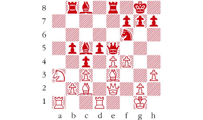 Black to play. This position is a variation from Maslak-Smerdon, Pardubice 2007. Black has powered through on the kingside. How can he finish off? Answers to me at The Spectator by Tuesday 8 September or via email to victoria@spectator.co.uk or by fax on 020 7681 3773. The winner will be the first correct answer out of a hat, and each week there is a prize of £20. Please include a postal address and allow six weeks for prize delivery.