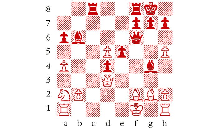 Black to play. This position is a variation from So-Aronian, St Louis 2015. How can Black conclude the attack? Answers to me at The Spectator by Tuesday 15 September or via email to victoria@spectator.co.uk or by fax on 020 7681 3773. The winner will be the first correct answer out of a hat, and each week there is a prize of £20. Please include a postal address and allow six weeks for prize delivery.
