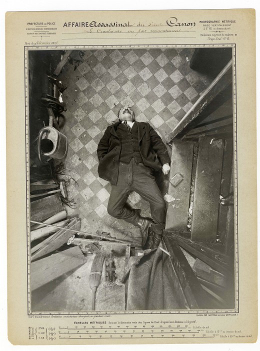 In the early 20th century, when photography was in its nascent state, it was considered an impartial technique for investigation. Alphonse Bertillon, a French police officer and biometrics researcher, developed a protocol for its use in criminal investigations, which became known as ‘metric photography’. A camera with a wide-angle lens was suspended on a tripod over the corpse, in order to establish the position within the crime scene. At the time, this was considered scientific, but to a modern eye, these images look deliciously macabre, and the way they are framed is quite attractive. They are full of tantalising details, and we are left to imagine why — and how — characters such as Monsieur Mathieu, Madame Laurent and Monsieur Delorme were bumped off.
