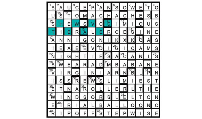 The thematic phrase is ‘The Waves’, shown in a wave pattern in the grid. It is the title of a novel by 29A/33; 8, 30 and 36 are types of ocean waves; 14, 16 and 32 are other types of waves.