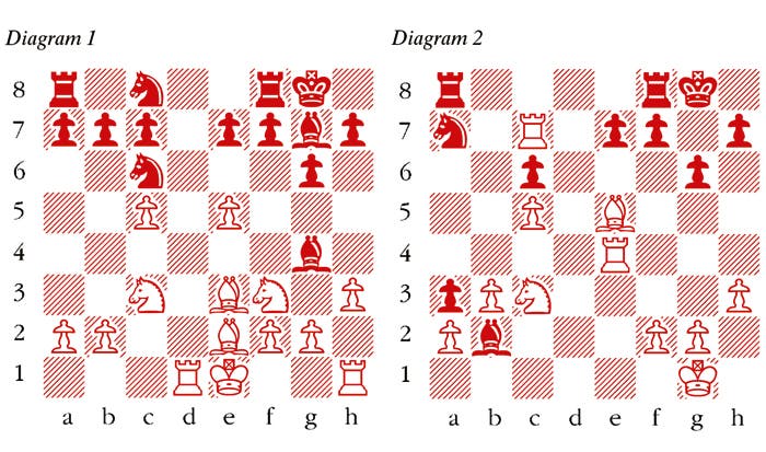 1 d4 Nf6 2 c4 g6 3 Nc3 d5 4 Nf3 Bg7 5 Qb3 dxc4 6 Qxc4 0-0 7 e4 Bg4 8 Be3 Nfd7 9 Rd1 Nc6 10 Be2 Nb6 11 Qc5 Qd6 12 e5 Qxc5 13 dxc5 Nc8 14 h3 (see diagram 1) Karpov’s home analysis showed that after this move Black’s defence was very difficult as the prospects of the knight at c8 could be significantly restricted. 14 … Bxf3 15 Bxf3 Bxe5 16 Bxc6 A surprise. Kasparov was expecting 16 Rd7, planning 16 … e6 17 Bxc6 bxc6 18 f4 Bg7! 19 Rxc7 Re8 20 Rxc6 Ne7 21 Ra6 Reb8, and Black regains the pawn with sufficient counterplay. 16 … bxc6 17 Bd4 White intends an exchange of minor pieces, leaving the opponent with a broken pawn structure on the queenside and a restricted knight on c8. 17 … Bf4 18 0-0 a5? An incorrect plan. 18 … e5 — as in Karpov-Timman, played later at Tilburg, 1986 — would have enabled Black to resist. 19 Rfe1 Now the knight on c8 cannot manage to get to the centre, and the game is essentially decided. 19 … a4 20 Re4 Bh6 21 Be5 a3 22 b3 Na7 At last the luckless beast comes into play, but its imaginary freedom is acquired at too high a price. 23 Rd7 Bc1 24 Rxc7 Bb2 (see diagram 2) 25 Na4 The simplest and most convincing solution. After the incautious 25 Rxe7 Rfe8 keeps Black alive, for example: 26 Bd4 Rxe7 27 Rxe7 Rd8 28 Be5 Nb5 29 Nxb5 Bxe5 30 Rxe5 Rd1+ 31 Kh2 cxb5 32 b4 Kf8, and Black can still struggle on. 25 … Nb5 26 Rxc6 Rfd8 27 Rb6 The main idea of White’s strategy. He is not diverted by the capture of the bishop on b2, but tightens his grip. 27 … Rd5 28 Bg3 Nc3 29 Nxc3 Bxc3 30 c6 Bd4 31 Rb7 Black resigns