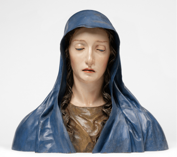 Some of the great marvels of the V&A are repurposed here. A vanitas painting by N.L. Peschier of 1659 has the skull, rumpled sheets of music, ears of corn, a smouldering piece of wood; the complement to world authority in trade and science was the appalling realisation that its glories were fragile and temporary. More beautifully, there is José de Mora’s ‘Virgin of Sorrows’ (see p25) made in Granada in 1680, an illusionistically beautiful head of painted pine with glass details. This Virgin is often loaned and, when travelling internationally, her divinely tragic aspect is always popular. Especially in Korea.