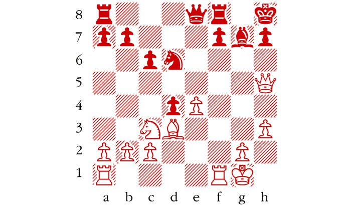 White to play. This is from Fischer-Benko, US Championship, New York 1963. The obvious 1 e5 is successfully parried by 1 … f5. What did Fischer do instead? Answers to me at The Spectator by Tuesday 19 January or via email to victoria@spectator.co.uk or by fax on 020 7681 3773. There is a prize of £20 for the first correct answer out of a hat. Please include a postal address and allow six weeks for prize delivery.