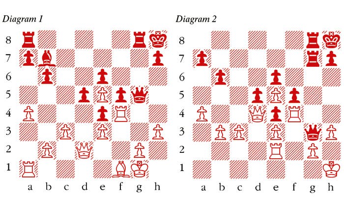 1 d4 Nf6 2 Nf3 e6 3 Bf4 b6 4 h3 Bb7 5 Nbd2 Bd6 A typically creative Alekhine idea. Taking advantage of the specifics of the position, in this case the inclusion of an early h2-h3, he produces an unusual response. 6 Bxd6 cxd6 7 e3 0-0 8 Be2 d5 9 0-0 Nc6 10 c3 Ne4 11 Nxe4 dxe4 12 Nd2 f5 It soon becomes clear that Rubinstein is in too passive a state of mind, and he rapidly drifts into trouble. 13 f4 g5 14 Nc4 d5 15 Ne5 Nxe5 16 dxe5 Kh8 17 a4 Rubinstein at last starts some active play on the queenside, but Alekhine condemns this move and says White had to seize his last chance to play 17 g3 Rg8 18 Kh2. After the text, that will no longer be possible. 17 … Rg8 18 Qd2 gxf4 19 Rxf4 Qg5 20 Bf1 (see diagram 1) 20 … Qg3 This is a subtle way to gain a tempo, as will become clear. 21 Kh1 Forced, since 21 … Qxh3 was an obvious threat. 21 … Qg7 The king will soon be required on g1, so Kh1 will actually prove to be a lost tempo. 22 Qd4 Ba6 23 Rf2 Qg3 24 Rc2 Bxf1 25 Rxf1 Rac8 Alekhine is relentless in his exploitation of the initiative. As he himself says, Black works with tempo gains the whole time. Now he threatens to win the a-pawn with … Rc4. 26 b3 Rc7 27 Re2 Rcg7 28 Rf4 Rc7 29 Rc2 Rcg7 30 Re2