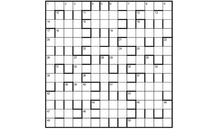 11/22, 36/1D, 48/2, 9/30 and 17/46 combine to form anagrams of the titles of five works (four of two words, one of three) by a writer whose name will appear diagonally in the grid and must be shaded.