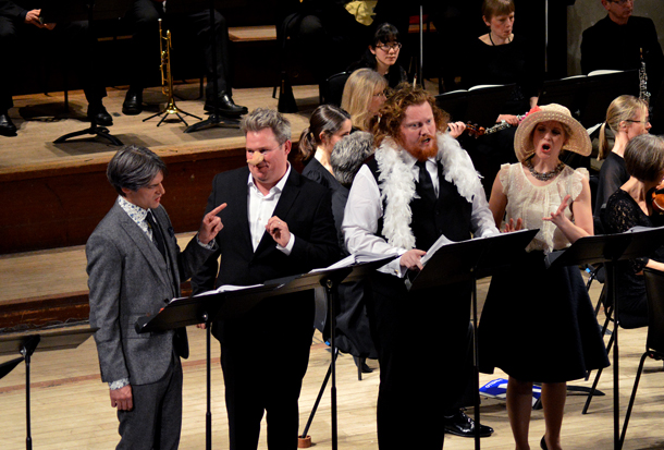 But none of this could damp the verve of a cast who gamely switched between comedy and contemplative nihilism, between Oliver’s angular idiom and the generous lyricism of mature Mozart (Goose was written concurrently with Entführung). From Elli Laugharne’s tireless Auretta to Fflur Wyn’s passionate Celidora and the comedy double-act of Robert Murray’s Biondello and Christopher Diffey’s Calandrino, all were excellent — characters in search of a composer, but finding themselves sent instead on a musical wild goose chase.