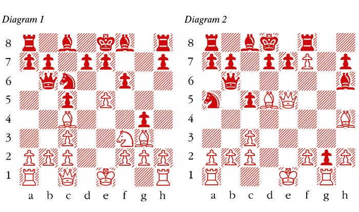 1 e4 c5 2 Nf3 Nf6 An eccentricity introduced by Nimzowitsch. In my opinion it represents one of his less felicitous ideas. After White’s treatment seen here Black is already in difficulties at an early stage. 3 e5 Nd5 4 Nc3 Nxc3 Possible is 4 … e6 but after 5 Nxd5 exd5 6 d4 White has much the freer position. 5 dxc3 Nc6 5 … b6 was seen in Michell-Nimzowitsch, Marienbad 1925 and White reacted with the feeble 6 Bd3, whereas in fact both 6 e6 and 6 Ng5 both leave Black struggling. 6 Bf4 Qb6 7 Qc1 f6 8 Bc4 Strong, natural and improving on 8 Bg3 Zude-Gheng, Staufer 2003. 8 … g5 This move is bold beyond belief, after which we are in uncharted territory. According to Alekhine’s precept, Carlsen is now fully prepared to invest material in refuting Black’s eccentric play. 9 Bg3 g4 (see diagram 1) 10 exf6 Giving up a piece to exploit Black’s self-inflicted weaknesses. 10 … gxf3 11 Qf4 fxg2 12 Rg1 Na5 13 f7+ Kd8 14 Bd5 Bh6 This is catastrophic. Black had to cling on with 14 … d6 15 0-0-0 Kc7 when 16 Bh4 maintains the pressure but is not yet conclusive. 15 Qe5 Rf8 16 Bh4 (see diagram 2) This is the simple refutation. Suddenly Black has no way to defend the e7-square and is obliged to launch a desperate rook sacrifice. 16 … Rxf7 17 Bxf7 Nc6 18 Qg3 Qxb2 19 Rd1 Qxc2 20 Bd5 Qf5 21 Rxg2 Bf4 22 Qf3 Kc7 White’s structure is a bit of a mess and his king is somewhat exposed. However, he is material ahead and Black suffers from an appalling lack of development. Carlsen mops up easily. 23 Rg5 Qf8 24 Bg3 e5 25 Rh5 a5 26 Rxh7 Ra6 27 Rf7 Qe8 28 Kf1 Bxg3 29 hxg3 Qh8 30 Kg2 Nd8 31 Rf8 Qg7 32 Rh1 Rh6 33 Rxh6 Qxh6 34 Qf6 Qxf6 35 Rxf6 d6 36 Kf3 b5 37 g4 Kd7 38 Rh6 Black resigns