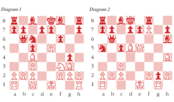 1 e4 c5 2 Nf3 Nf6 An eccentricity introduced by Nimzowitsch. In my opinion it represents one of his less felicitous ideas. After White’s treatment seen here Black is already in difficulties at an early stage. 3 e5 Nd5 4 Nc3 Nxc3 Possible is 4 … e6 but after 5 Nxd5 exd5 6 d4 White has much the freer position. 5 dxc3 Nc6 5 … b6 was seen in Michell-Nimzowitsch, Marienbad 1925 and White reacted with the feeble 6 Bd3, whereas in fact both 6 e6 and 6 Ng5 both leave Black struggling. 6 Bf4 Qb6 7 Qc1 f6 8 Bc4 Strong, natural and improving on 8 Bg3 Zude-Gheng, Staufer 2003. 8 … g5 This move is bold beyond belief, after which we are in uncharted territory. According to Alekhine’s precept, Carlsen is now fully prepared to invest material in refuting Black’s eccentric play. 9 Bg3 g4 (see diagram 1) 10 exf6 Giving up a piece to exploit Black’s self-inflicted weaknesses. 10 … gxf3 11 Qf4 fxg2 12 Rg1 Na5 13 f7+ Kd8 14 Bd5 Bh6 This is catastrophic. Black had to cling on with 14 … d6 15 0-0-0 Kc7 when 16 Bh4 maintains the pressure but is not yet conclusive. 15 Qe5 Rf8 16 Bh4 (see diagram 2) This is the simple refutation. Suddenly Black has no way to defend the e7-square and is obliged to launch a desperate rook sacrifice. 16 … Rxf7 17 Bxf7 Nc6 18 Qg3 Qxb2 19 Rd1 Qxc2 20 Bd5 Qf5 21 Rxg2 Bf4 22 Qf3 Kc7 White’s structure is a bit of a mess and his king is somewhat exposed. However, he is material ahead and Black suffers from an appalling lack of development. Carlsen mops up easily. 23 Rg5 Qf8 24 Bg3 e5 25 Rh5 a5 26 Rxh7 Ra6 27 Rf7 Qe8 28 Kf1 Bxg3 29 hxg3 Qh8 30 Kg2 Nd8 31 Rf8 Qg7 32 Rh1 Rh6 33 Rxh6 Qxh6 34 Qf6 Qxf6 35 Rxf6 d6 36 Kf3 b5 37 g4 Kd7 38 Rh6 Black resigns