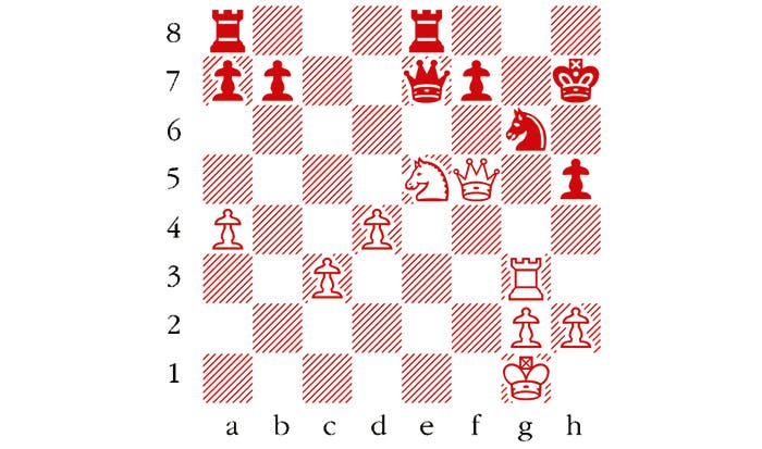 White to play. This is a variation from Aronian-Svidler, Moscow 2016. In this game Aronian misplayed his attack and Svidler ended up winning. The puzzle shows a possible conclusion if Svidler had defended inaccurately. How can White win? Answers via email to victoria@-spectator.co.uk by Tuesday 12 April. There is a prize of £20 for the first correct answer out of a hat. Please include a postal address.