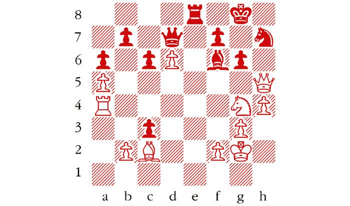 White to play. This position is from Dubov-Yandemirov, Russian Team Championship, Sochi 2016. How can White exploit the unfortunate placing of the black pieces? Answers to me at The Spectator by Tuesday 24 May or via email to victoria@spectator.co.uk or by fax on 020 7681 3773. There is a prize of £20 for the first correct answer out of a hat. Please include a postal address and allow six weeks for prize delivery.