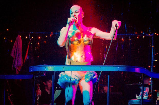 In fact, Pleasure is about as non-camp as any opera can be that features a six-foot man delivering an aria clad only in stiletto heels, make-up and balloons. Leslie Travers’s set comprises the neon-lit letters of the show’s name. An overflowing wheelie bin and a lavatory basin lurk behind them, plus a box of teabags (Yorkshire Tea, naturally) — reminders of bleak realities and small comforts. Within this single setting and a running time of little more than an hour, Simpson unfolds a tragedy that had audience members around me in tears. That’s a tribute to Simpson’s score: a dark, glistening thing that pulses with minimalist rhythms and heaves itself up into grand baroque gestures while letting vocal lines rise naturally and push through the texture. Tim Albery’s direction draws affecting and realistic performances from the central couple, Timothy Nelson and Nick Pritchard: a remarkably tender portrayal of love frustrated by class as much as by Steven Page’s malevolent drag queen (the main prejudice explored in Pleasure is between generations).