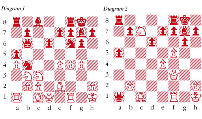 1 e4 d6 2 d4 Nf6 3 Nc3 g6 4 f4 Bg7 5 Nf3 0-0 6 Be2 Today White normally plays the more aggressive and superior 6 Bd3. 6 … c5 7 dxc5 Uninspiring but 7 0-0 cxd4 8 Nxd4 is a Classical Dragon where White has played f2-f4 slightly too soon, and either 8 … Nbd7 9 Kh1 a6 or 8 … Nc6 9 Be3 Qb6 gives Black good play. 7 … Qa5 8 0-0 Qxc5+ 9 Kh1 Nc6 Black achieved a favourable Dragon set-up, since White’s pieces are posted rather passively. 10 Nd2 a5 Black’s queen now gets extra squares, while a knight on b3 is undermined by … a5-a4. 11 Nb3 Qb6 12 a4 Nb4 White will experience problems ejecting this knight. 13 g4 (see diagram 1) Fischer’s psychotic last move is reminiscent of a Star Trek episode where Spock grapples with human feelings and loses control. 13 … Bxg4! 14 Bxg4 Nxg4 15 Qxg4 Nxc2 The point: Black gets a nasty double attack on b3 and a1, regaining all his material, with the bonus of overextending White at the end of it. 16 Nb5 Nxa1 17 Nxa1 Qc6 18 f5 Weakening further, but the time is long gone for a passive move such as 18 Qf3. It becomes quite clear that stalling fails to diminish the urgency in White’s rotting position. 18 … Qc4 19 Qf3 Qxa4 20 Nc7 Qxa1 (see diagram 2) 21 Nd5 Grabbing material with 21 Nxa8 Rxa8 is no better. After 22 fxg6 fxg6 23 Qf7+ Kh8 24 Qxe7 Qb1! 25 Qxb7 Re8 26 Re1 Qd3! (threatening … Qf3+ followed by … Bd4+) 27 Kg2 Qc2+ 28 Kh1 Be5 mates. 21 … Rae8 22 Bg5 Qxb2 23 Bxe7 Be5 24 Rf2 Qc1+ 25 Rf1 Qh6 A dual purpose move. Black threatens mate on h2 and the queen enlists yet another defender of her king’s dark squares. 26 h3 gxf5 27 Bxf8 Rxf8 28 Ne7+ Kh8 29 Nxf5 Qe6 30 Rg1 a4 31 Rg4 Qb3 32 Qf1 a3 33 Rg3 Qxg3 White resigns 34 Nxg3 a2 wins.