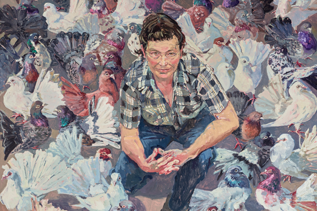 The Wynne primarily for landscapes, founded in 1897, was this year won by the Ken Family Collaborative for Seven Sisters. The Sulman, established in 1936, for ‘subject or genre painting’, was won by Esther Stewart for Flatland Dreaming. This year all the prize winners were women; indeed the Wynne went to a family of women. And there was one woman, Lucy Culliton, who remarkably, was a finalist in all three prizes. In her Archibald entry, a handsome self-portrait Lucy and fans, she depicts herself surrounded by her collection of fan-tail pigeons. Pigeons without fantails are the subject of her striking, limited palette Sulman entry. My favourite is her Wynne finalist: a 170cms square landscape Monaro/ Ando painted on a property near her home where she spent her childhood. It is utterly beautiful and deeply felt.