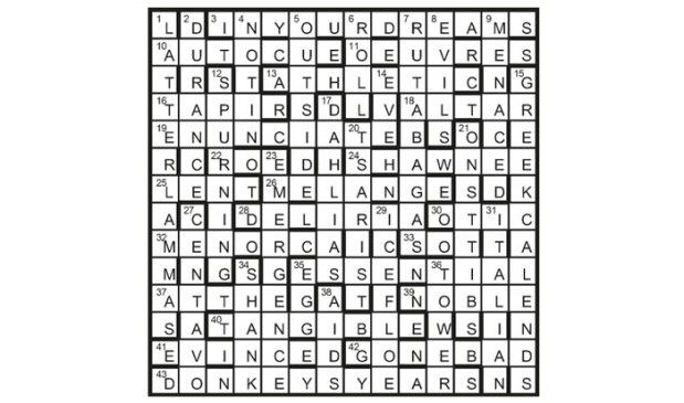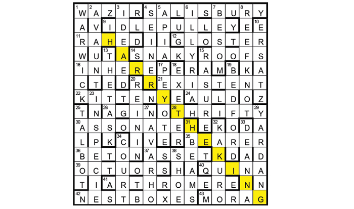 ‘Harry the King, BEDFORD (19) and EXETER (18), WARWICK (1D) and TALBOT (25), SALISBURY (4A) and GLOSTER (12)’ (Henry V, act 4, sc.3) are named in Henry V’s speech at AGINCOURT (26/34). HARRY THE KING (diagonally from the third row) was to be shaded.