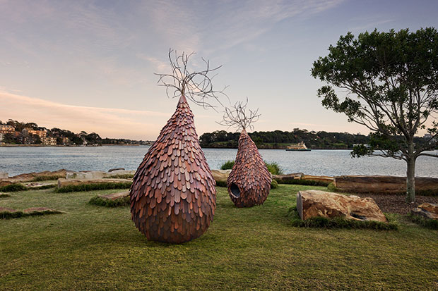 Robertson-Swann’s work, Weighty Matters is three large unrelated metal works he has created over 40 years, one of which, Tony’s Tower II, honours his mentor Sir Anthony Caro. Ken Unsworth’s Harlequin Shuttle, on loan from its original commissioner, Scenic World Katoomba, is eight metres tall and covered in coloured plexiglass. Margarita Sampson, a popular favourite from Sculpture by the Sea, is represented by The Grove on the Sea Wall Lawn. The Milky Way Sisters, three Sydney artists, have contributed, Barangaroo Dreaming representing a huge crinoline of eight layers, one for each of eight generations.