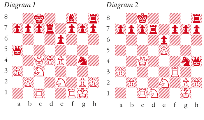 1 e4 d5 2 exd5 Qxd5 3 Nc3 Qa5 4 d4 Nf6 5 Bc4 Nc6 6 Nge2 Be6 Black speeds up his development in an original manner. 7 Bd3 7 Bxe6 is the critical test of Black’s idea. 7 … 0-0-0 8 0-0 Bf5 9 Be3 Bxd3 10 Qxd3 Nb4 11 Qc4 Giving up the c-pawn in the hope of gaining an attack along the c-file. 11 … Nxc2 12 Rac1 Nxe3 13 fxe3 e6 14 e4 Rd7 Defending the weak points on both c7 and f7. 15 a3 Ng4 This initiates an attack by threatening to come in on e3 (diagram 1) 16 Rf3 Passive. White should prefer 16 Rxf7 Rxf7 (16 … Qh5 17 Qxe6 Qxf7 is very similar as 17 … Qxh2+ 18 Kf1 leads nowhere for Black) 17 Qxe6+ Rd7 18 Qxg4 with a dynamically equal position. 16 … Qg5 17 Nd1 Qd8 This retreat is unnecessary. 17 … c6 gives Black a good game. 18 Ndc3 Qg5 19 Nd1 Bd6 20 e5 This plausible move is disastrous. White should have played 20 h3. 20… Bxe5 21 dxe5 Qh4 This is strong but even better was the simple 21 … Nxe5 22 Qe4 Nxf3+ 23 Qxf3 Rhd8 with a crushing position (diagram 2) 22 Rg3 Allowing an attractive finish. White had to try 22 Qc3 Qxh2+ 23 Kf1 Qh1+ 24 Ng1 Nh2+ 25 Kf2 Nxf3 26 Nxf3 when White has some chances (compared to the variation at move 21) as the black position is rather disorganised and White maintains the important e5-pawn. 22 … Qxh2+ 23 Kf1 Rxd1+ 24 Rxd1 Qxg3 White resigns