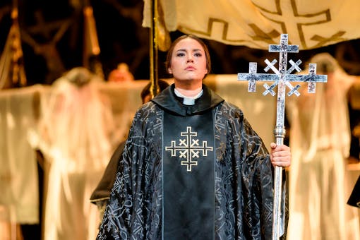 On the first night her intensity in Act I was such that she didn’t manage, quite, to sustain it to the end of the opera, that ever-astonishing chain of arias and duets which culminates with her ascending the funeral pyre with her treacherous — and illicit — lover Pollione: though the fire was there cross-shaped, she was mercy-killed by Oroveso with a pistol, but since the last minute of the opera is the only perfunctory music in the whole score, perhaps that was fitting. Unlike almost all Normas, Yoncheva made a striking entry, not only dramatically but vocally, and sang ‘Casta diva’ in a trance, inducing one in the audience — it was no showpiece, but established the nature of the Druids’ devotion.