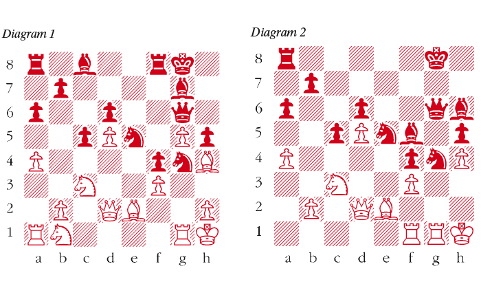 1 d4 Nf6 2 c4 g6 3 f3 e6 4 e4 c5 5 d5 d6 6 Ne2 Bg7 In spite of a non-standard opening sequence, the game has transposed to a recognisable Benoni formation. 7 Nec3 a6 8 a4 Nh5 9 Be3 exd5 10 cxd5 f5 11 exf5 gxf5 12 Qd2 Varying from Garriga-Antoli, Mislata 2014 where 12 f4 was played. 12 … 0-0 13 Be2 Nd7 Allowing Black to advance with … f4 seems to me to be overly encouraging of Black’s counter-offensive. White should have taken his final chance to play 14 f4 himself. 14 0-0 14 … f4 15 Bf2 Qg5 16 g4 Ne5 17 Kh1 Nf6 18 Rg1 Qg6 19 Bh4 Much stronger is the development of his second knight with 19 Na3. 19 … h5 The immediate 19 … Nfxg4 20 fxg3 f3 is another way to pursue the initiative. 20 g5 Nfg4 (see diagram 1) 21 Ne4 21 fxg4 hxg4 is very strong for Black. 21 … Bf5 22 Nf6+ A rush of blood to the head. He must consolidate with 22 Nbc3. 22 … Rxf6 23 gxf6 Bxf6 White’s bishop is now stuck as 24 Be1 is met by 24 … Bxb1. 24 Nc3 Bxh4 25 Raf1 Bg5 26 h4 Bh6 (see diagram 2) 27 fxg4 White finally takes the knight but Black’s kingside pawn mass is now overwhelming. 27 … hxg4 28 Rxf4 Qh5 29 Rg2 Qxh4+ 30 Kg1 Ng6 31 Rxf5 Bxd2 32 Rxg4 Bxc3 33 bxc3 Qe1+ 34 Bf1 Kg7 35 Rfg5 Qb1 White resigns