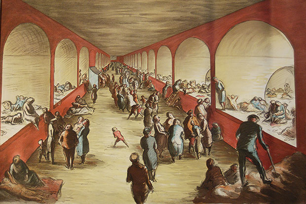 He was a serious artist, much admired by Kenneth Clark, often compared to Daumier for his thick outlines and heavy shadows, and as an official war artist he was probably the most effective in capturing the human aspect of the war. He was quite extraordinarily prolific — one of the good things about being financially hard-pressed quite a lot of the time — and his oeuvre, represented here in more than 100 pieces, encompasses his advertising and commercial work (there’s a charming poster for Guinness showing a cheery workman carrying not only a piano but also a piano player), his many illustrations for adult books, his pictures of London pub and street scenes and his war paintings.