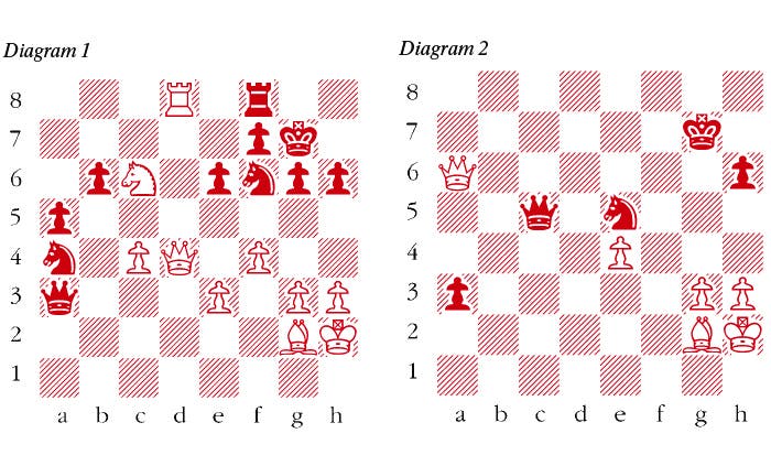 35 … bxc5 allows 36 Qd6 when White will break into Black’s camp on f7. However, the move is a serious oversight and White should have opted for 35 Ne5. 35 … Rxd8 36 Nxd8 Nxc5 37 Qd6 Qd3 Karjakin misses a chance. 37 … Qa4 wins as the black queen can return to d7 to defend. After 38 Qxb6 Ncd7 Black is a clear pawn ahead. 38 Nxe6+ Now White is back in the game. 38 … fxe6 39 Qe7+ Kg8 40 Qxf6 a4 41 e4 Qd7 42 Qxg6+ Qg7 43 Qe8+ Qf8 44 Qc6 Also possible is 44 Qg6+ Kh8 45 e5 a3 46 Qb1. 44 … Qd8 45 f5 a3 46 fxe6 Kg7 47 e7 Safer is 47 Qb5 Nxe6 48 Qb4 when White will never be in danger. 47 … Qxe7 48 Qxb6 Nd3 49 Qa5 Carlsen had to jettison a pawn with 49 e5 to make room for his bishop to operate. 49 … Qc5 50 Qa6 Ne5 (see diagram 2) 51 Qe6 The final blunder. 51 h4 was obligatory. 51 … h5! An inspired winning move. Black plans to defend against perpetual check by placing his knight on g6 to shield his king on h6. 52 h4 a2 White resigns 53 Qxa2 Ng4+ 54 Kh3 Qg1 55 Bf3 Nf2+ wins the queen.